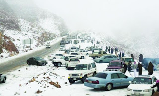 The locals have come out in force to enjoy the unusual weather. This picture from the Arab News is exactly what I'd expect to find on a snow covered road in Saudi - cars strewn about the place on purpose.